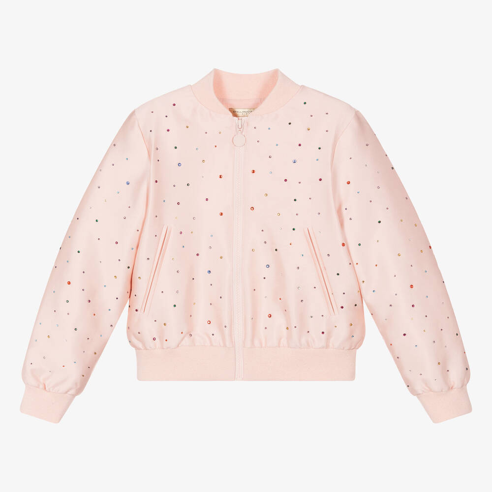 Blush pink jacket for teen girls by British label Stella McCartney Kids, scattered with colourful diamantés for an eye-catching sparkly look. Made in a soft cotton and silk blend, the twill fabric has a lovely sheen and the ribbed trims are woven with glittery lurex thread for added glam. It has a branded zip front, two pockets, and a lightweight viscose lining for added comfort. The Stella McCartney fit can be quite small so choose a size up if you want room to grow.