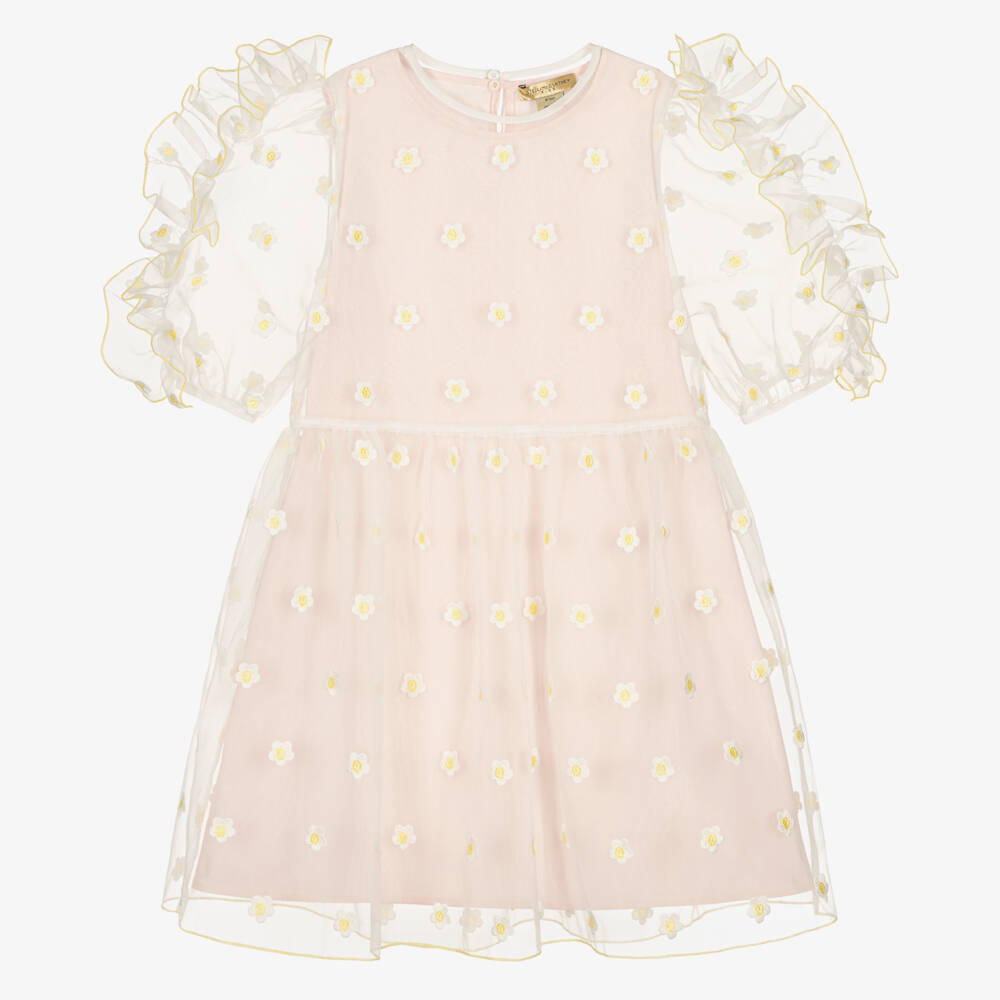 Romantically styled in pastel hues, a pink two-in-one dress for teen girls, from Stella McCartney Kids. Made from recycled materials, the sheer organza overlay is embroidered in daisies, with charming ruffled sleeves and yellow trims. There is a keyhole button fastening on the back, which is daisy-shaped for a feminine finish. In a simplistic A-line silhouette, the cotton dress is placed underneath the overlay to complete the look. The Stella McCartney fit can be quite small so choose a size up if you want room to grow.