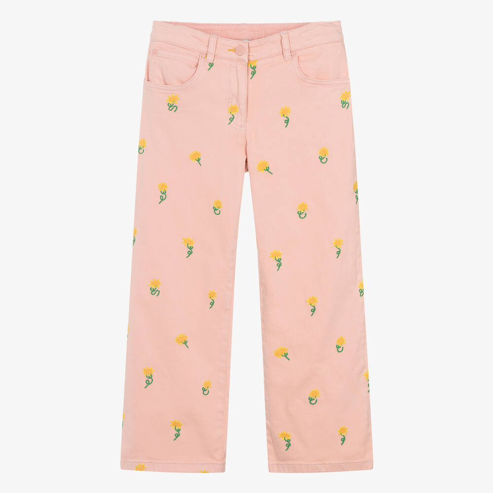 Pink wide-leg jeans for teen girls by Stella McCartney Kids. Adding a splash of colours to the casual wardrobe, they are embroidered with lovely yellow and green sunflowers. This five-pocket style has wide legs and a beige logo tab on the back and fastens with a hook and zip on the front. They are made in soft organic cotton denim with comfortable stretch. The Stella McCartney fit can be quite small so choose a size up if you want room to grow.