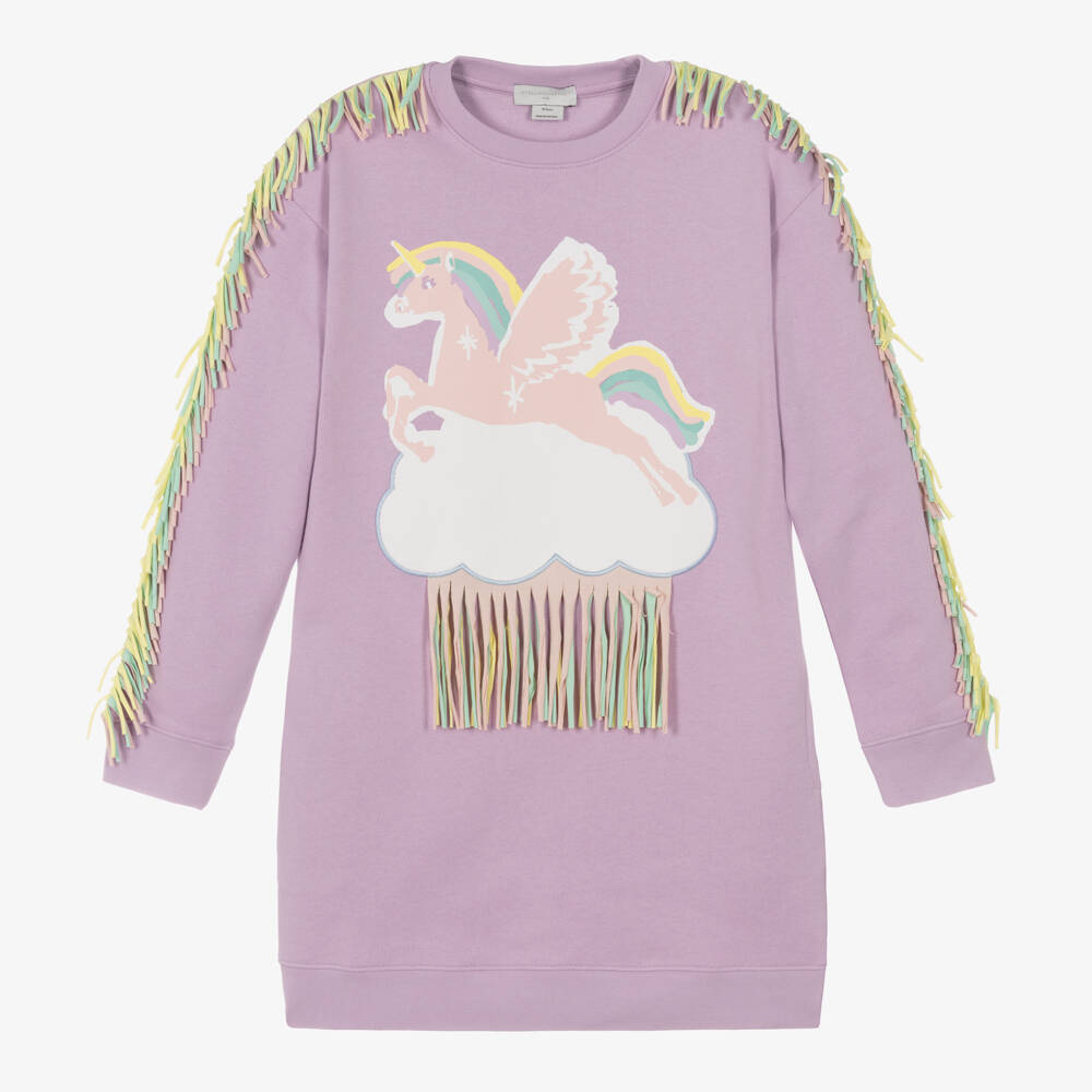 Lilac purple sweatshirt dress for teen girls from British designer Stella McCartney Kids. Relax in boho style, in this casual and comfortable dress with a flying unicorn print on the front and fringe trims adding a quirky finish. Easy to wear, it has useful concealed side pockets and is made in soft, mid-weight organic cotton jersey with a fleecy feel inside. The Stella McCartney fit can be quite small so choose a size up if you want room to grow.