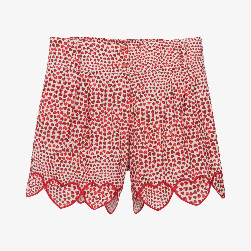 Gorgeous red and white shorts for teen girls by Stella McCartney Kids. Patterned with red hearts, the brand's circular logo is subtly printed throughout for a discreet designer touch. Beautifully lightweight, they are made in soft organic cotton, with useful side seam pockets and an embroidered red heart-shaped hemline. The waistband is shirred on the back for comfort, with button and zip fastenings on the front. The Stella McCartney fit can be quite small so choose a size up if you want room to grow.