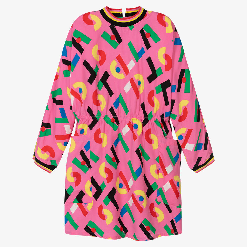 Pink twill dress for teen girls from Stella McCartney Kids, with a Stella logo print. It has an elasticated waist for an easy-wearing silhouette. The neckline and wrists are ribbed in striped jersey for added comfort, with two patch pockets on the front to finish the look. This garment started life as a tree from a sustainably managed forest or plantation.