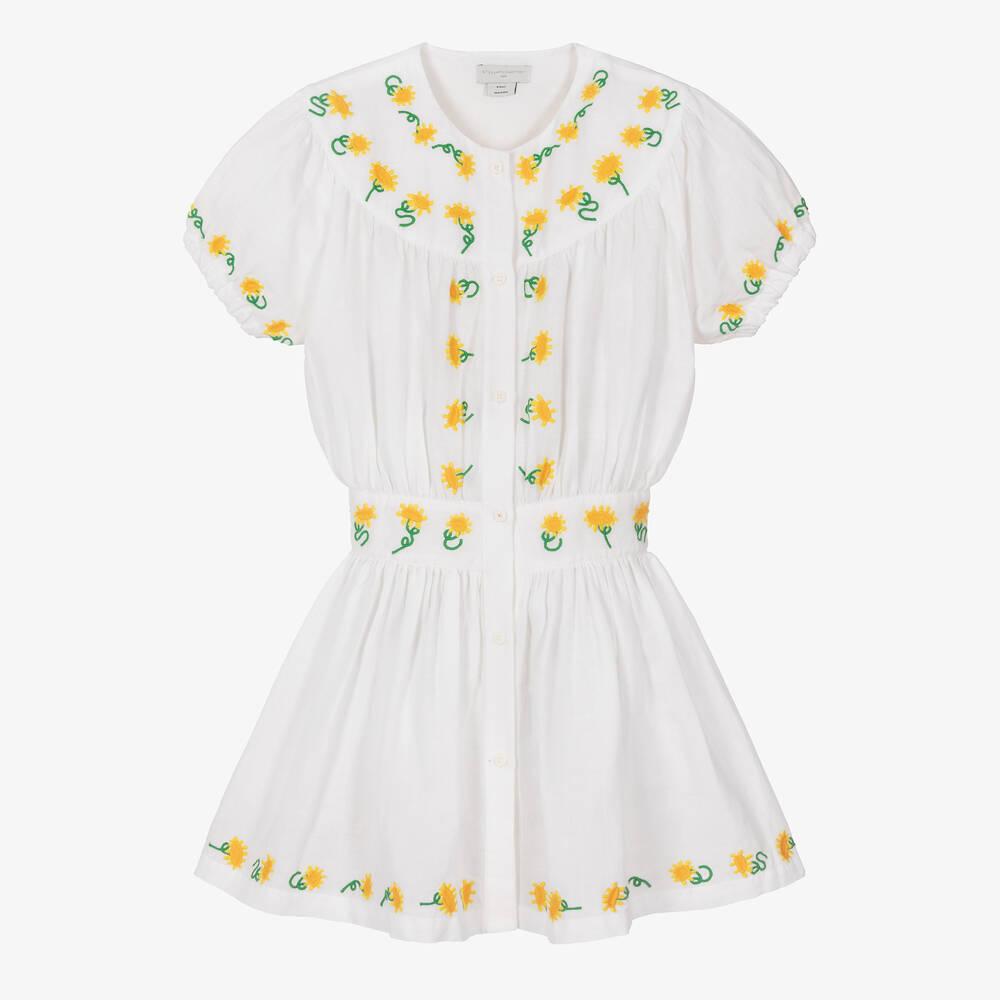 Pretty white dress for teen girls by Stella McCartney Kids, patterned with vibrant yellow and green embroidered sunflowers. With a blouson style top and short skirt, this charming dress fastens with logo buttons on the front and is made in a lightweight linen and cotton blend. The Stella McCartney fit can be quite small so choose a size up if you want room to grow.