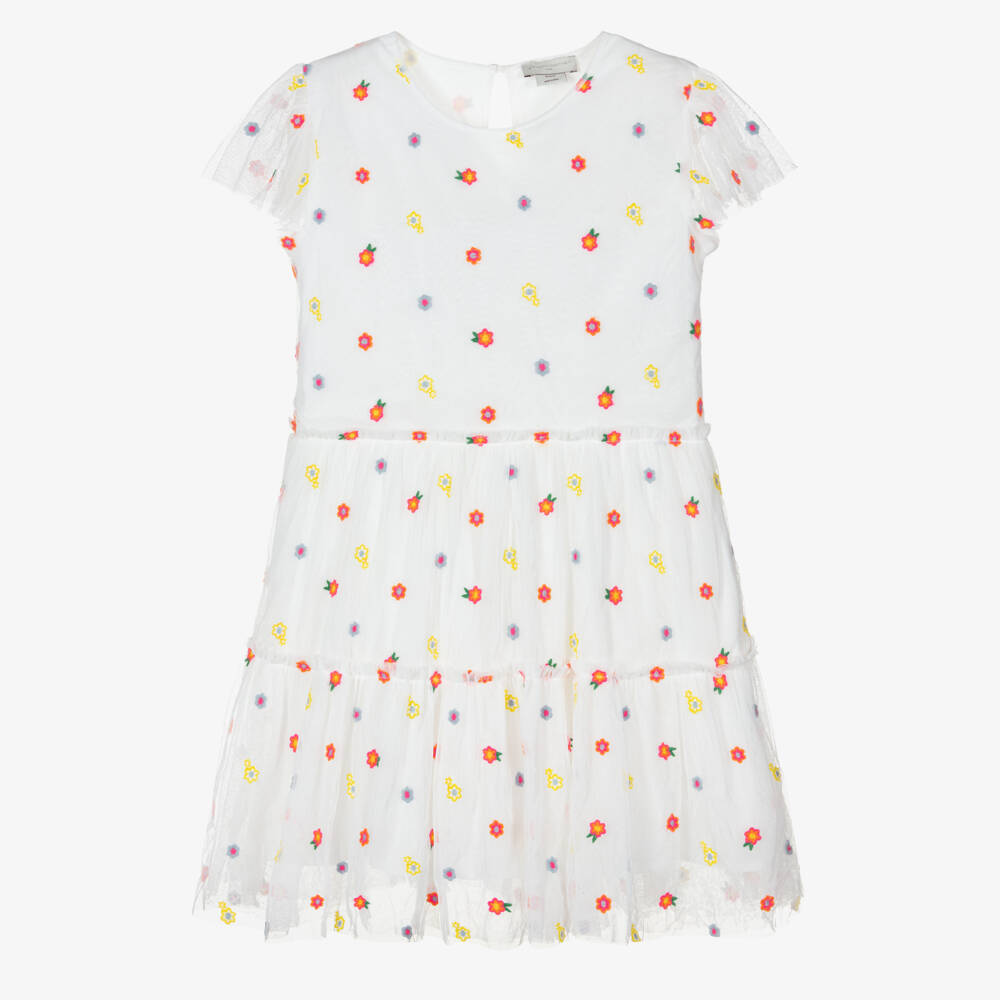 White tulle dress for teen girls by Stella McCartney Kids, embroidered all over with fun and colourful flowers. It has pretty flutter sleeves and a feminine tiered skirt, with a charming keyhole button fastening on the back. The fabric is made from recycled materials and is fully lined in lightweight cotton for comfort. The Stella McCartney fit can be quite small so choose a size up if you want room to grow.