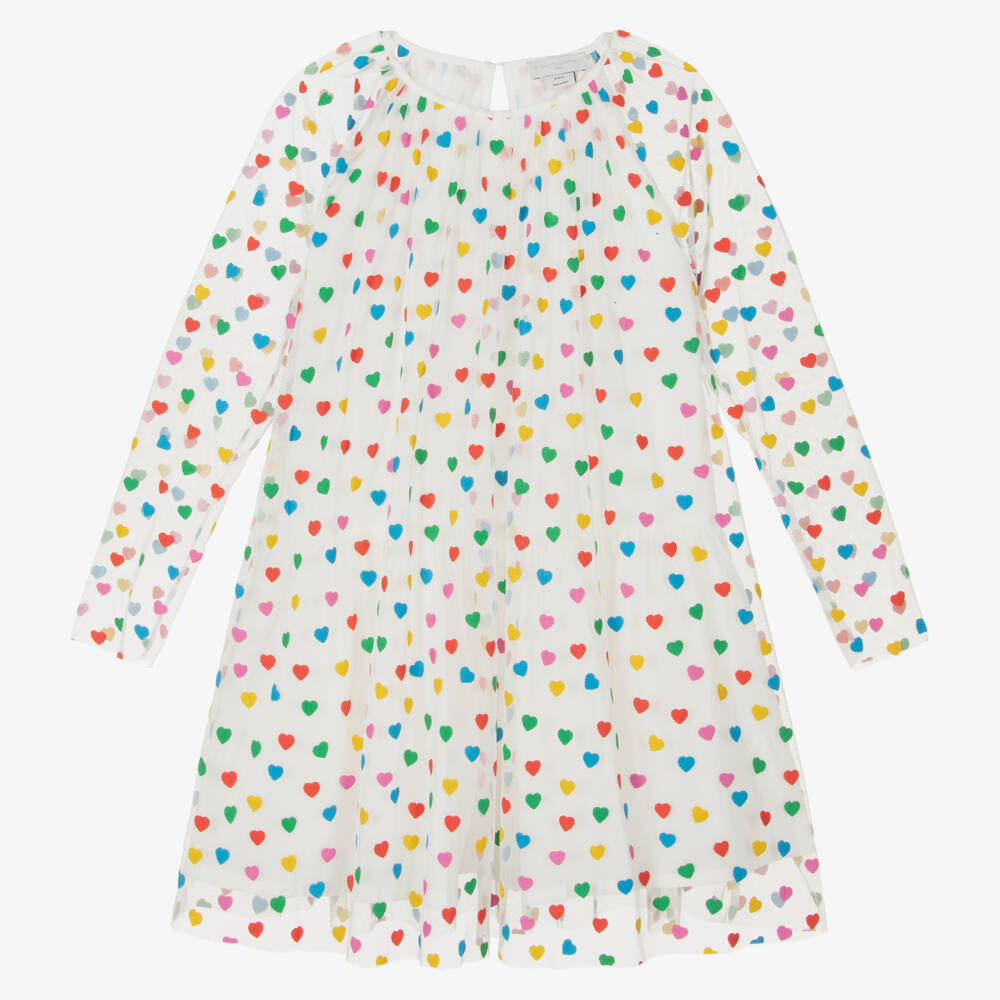 Beautiful off-white tulle dress for teen girls by British designer Stella McCartney Kids. Patterned with bright and bold hearts, for a burst of colour, it has a lightweight cotton lining for comfort and modesty. A single button fastening secures the key hole details on the back for a feminine finish. The Stella McCartney fit can be quite small so choose a size up if you want room to grow.