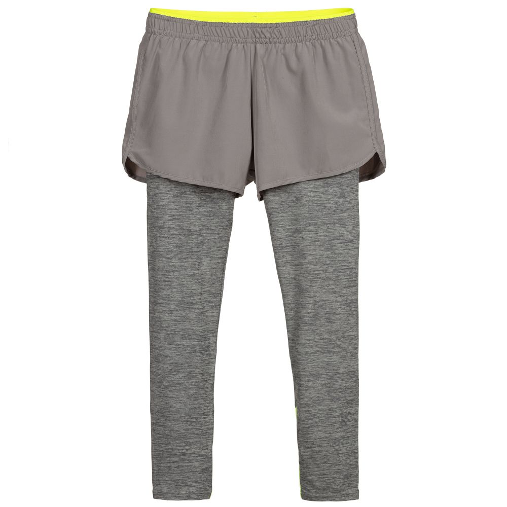 Grey sporty shorts for girls by British designer Stella McCartney Kids, with neon yellow trims. Made in fast drying fabric for extra comfort during exercise, they have grey marl leggings attached. The brand's neon yellow logo is printed on the back zipped pocket.