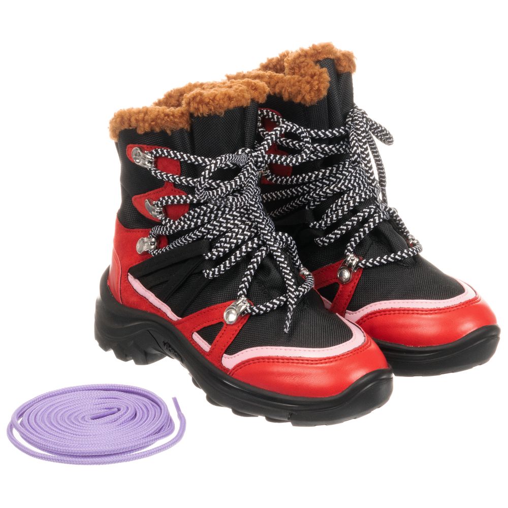 Girls red, black and pink hiking boots by Stella McCartney Kids. Made in nylon with soft faux leather trims, they have a deep tread Vibram® non-slip rubber sole. These lace up boots are lined in grey teddy fleece with a Aquastop® water repellent & breathable membrane between the upper and lining. They come with an extra pair of purple laces.