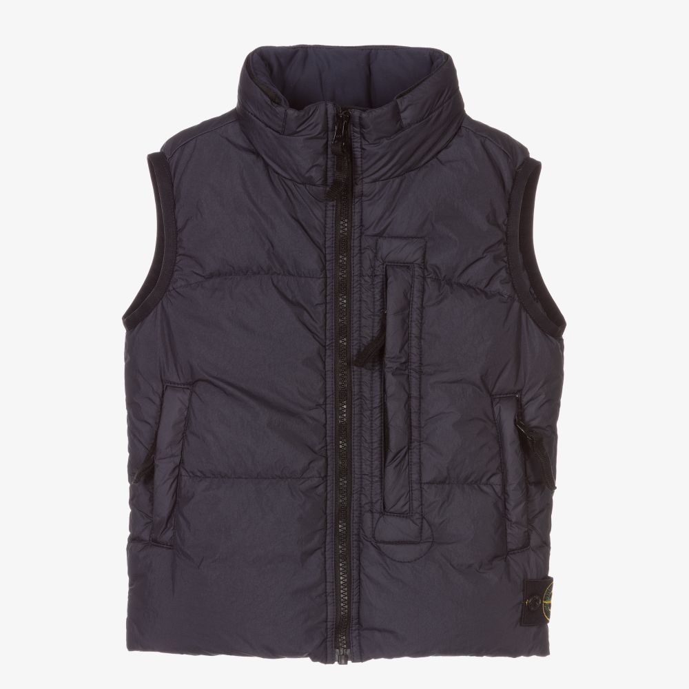Navy blue puffer gilet for boys by Italian designer Stone Island Junior. Soft and silky with warm down padding, it has three useful zipped pockets on the front and the brand's removable logo badge on one side. The gilet has a hood that folds away into the collar.