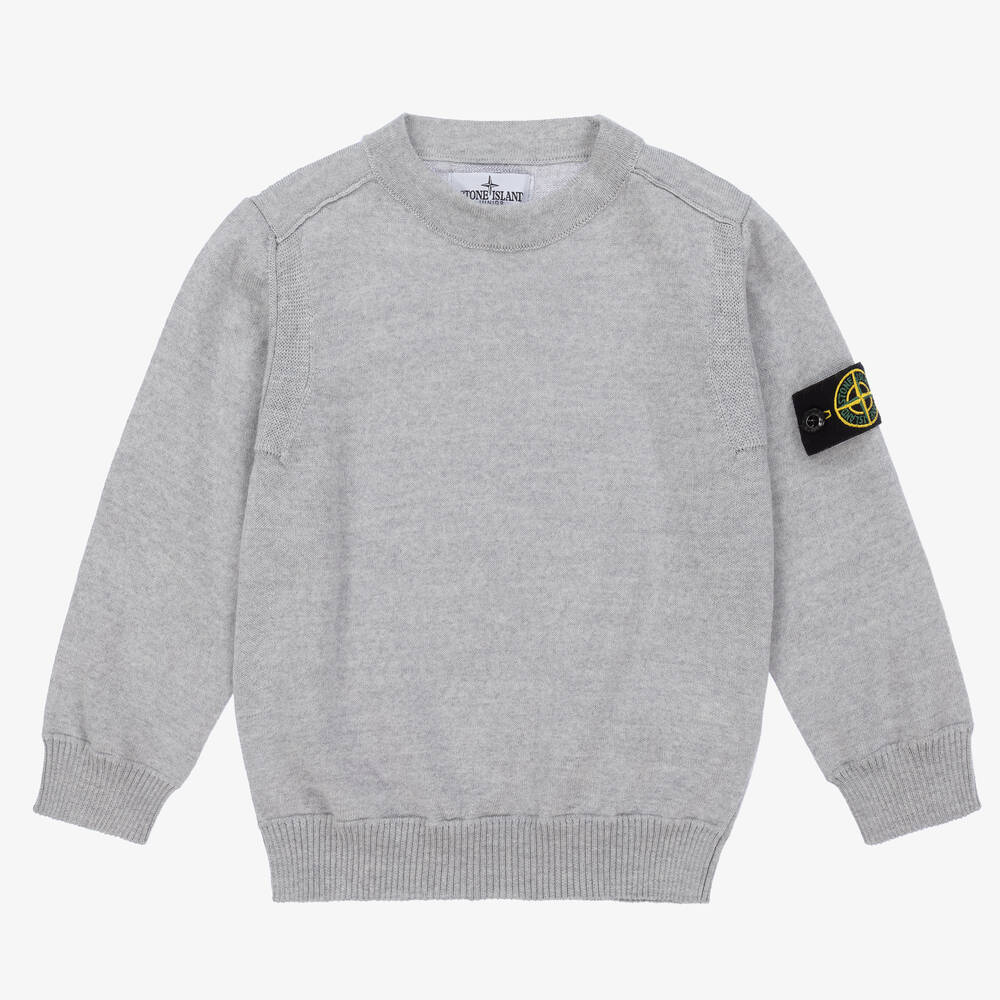 Grey sweater for boys by Stone Island Junior, knitted in luxuriously soft wool. The brand's iconic removable logo badge is on one sleeve in black, with ribbed trims and a relaxed crew neckline.