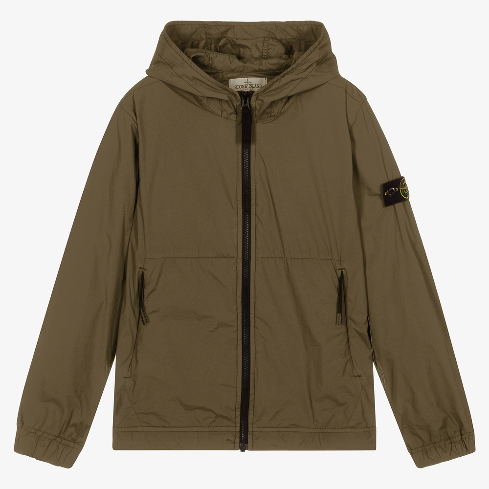 Khaki green windbreaker jacket for teen boys by Stone Island Junior, made in silky smooth nylon with a polyurethane coating. One sleeve is trimmed with the brand's iconic logo badge, which is removable with button fastenings. Lightweight and hooded, it has an exposed front zip fastening, zipped front pockets and elasticated cuffs.
