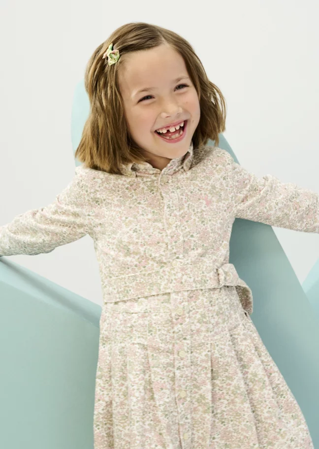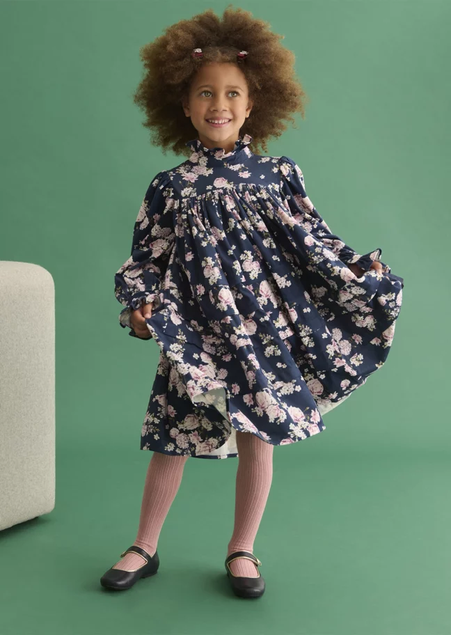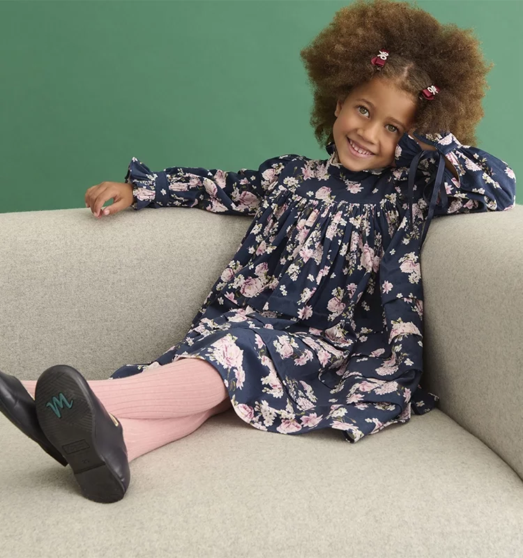 “This floral design from Petite Amalie's new Steph collection, styled with ribbed tights and two-tone shoes, is one of our favourite looks for her — it’s comfy enough for home, yet thoughtfully put-together for shared meals and special moments."