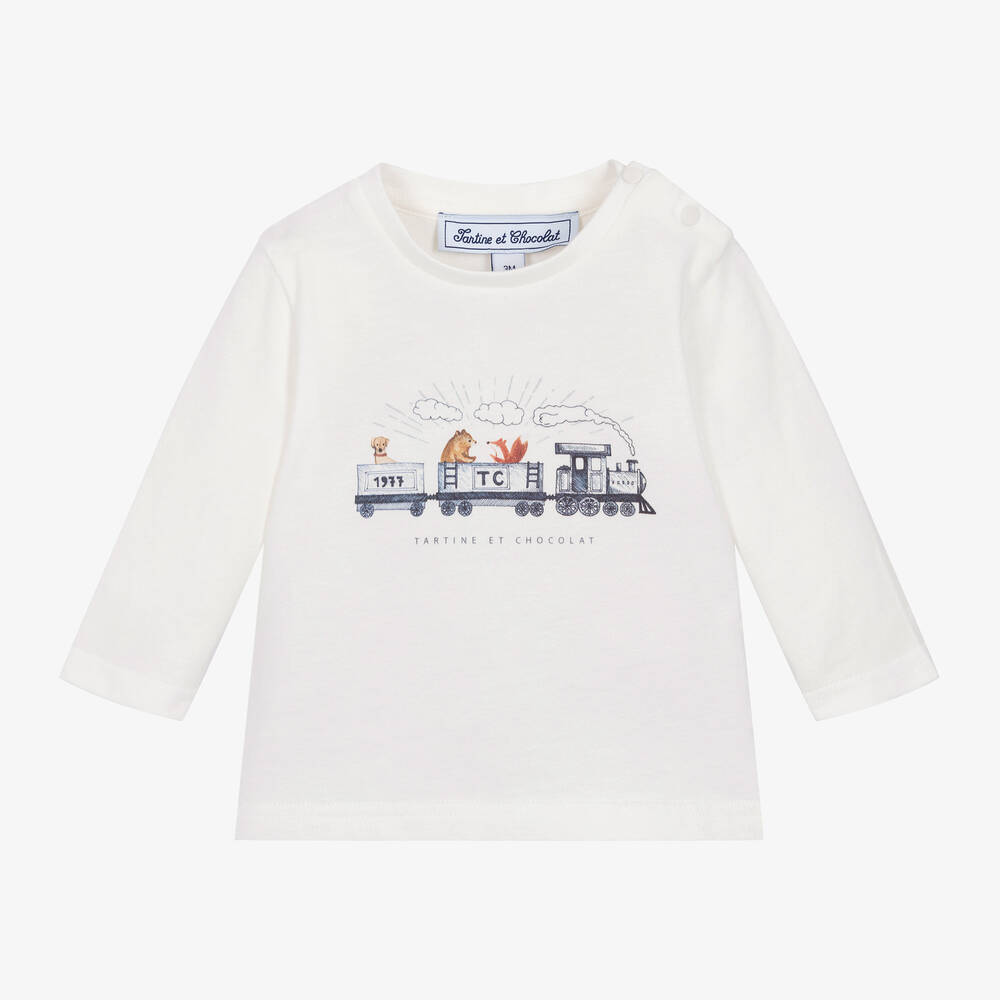 An ivory long-sleeved top for baby boys by classic French brand Tartine et Chocolat, made in soft cotton jersey. This casual style has a cute steam train logo print on the front, with cute animal passengers. There are popper fastenings on one shoulder to help with dressing.