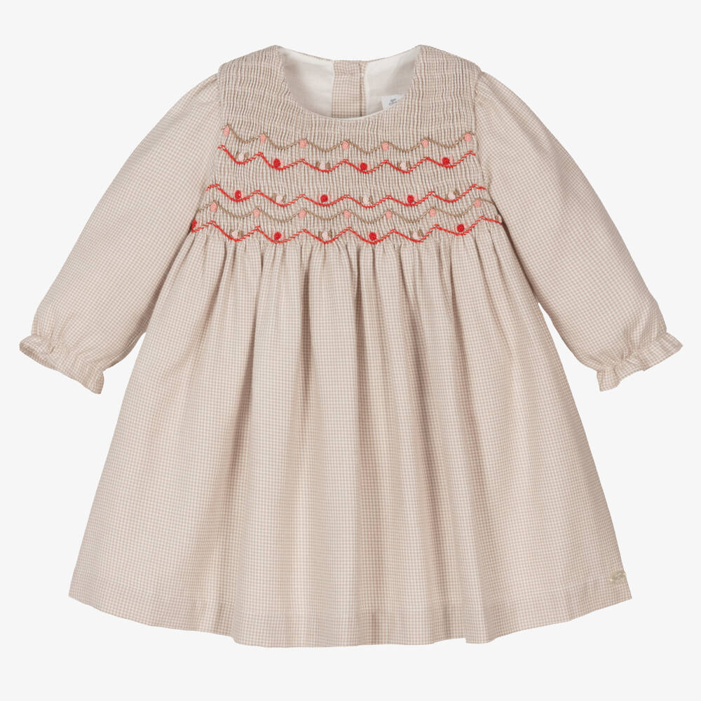 In a fine houndstooth check, this charming beige dress for baby girls is by French brand Tartine et Chocolat. Woven in soft cotton, it has a ruched bodice, with traditional hand embroidery detailing in red, pink and beige. There are pretty puffed sleeves, with frilly elasticated cuffs that are gently elasticated. Lined in lightweight cotton for comfort, the dress fastens with pearlescent buttons on the back.