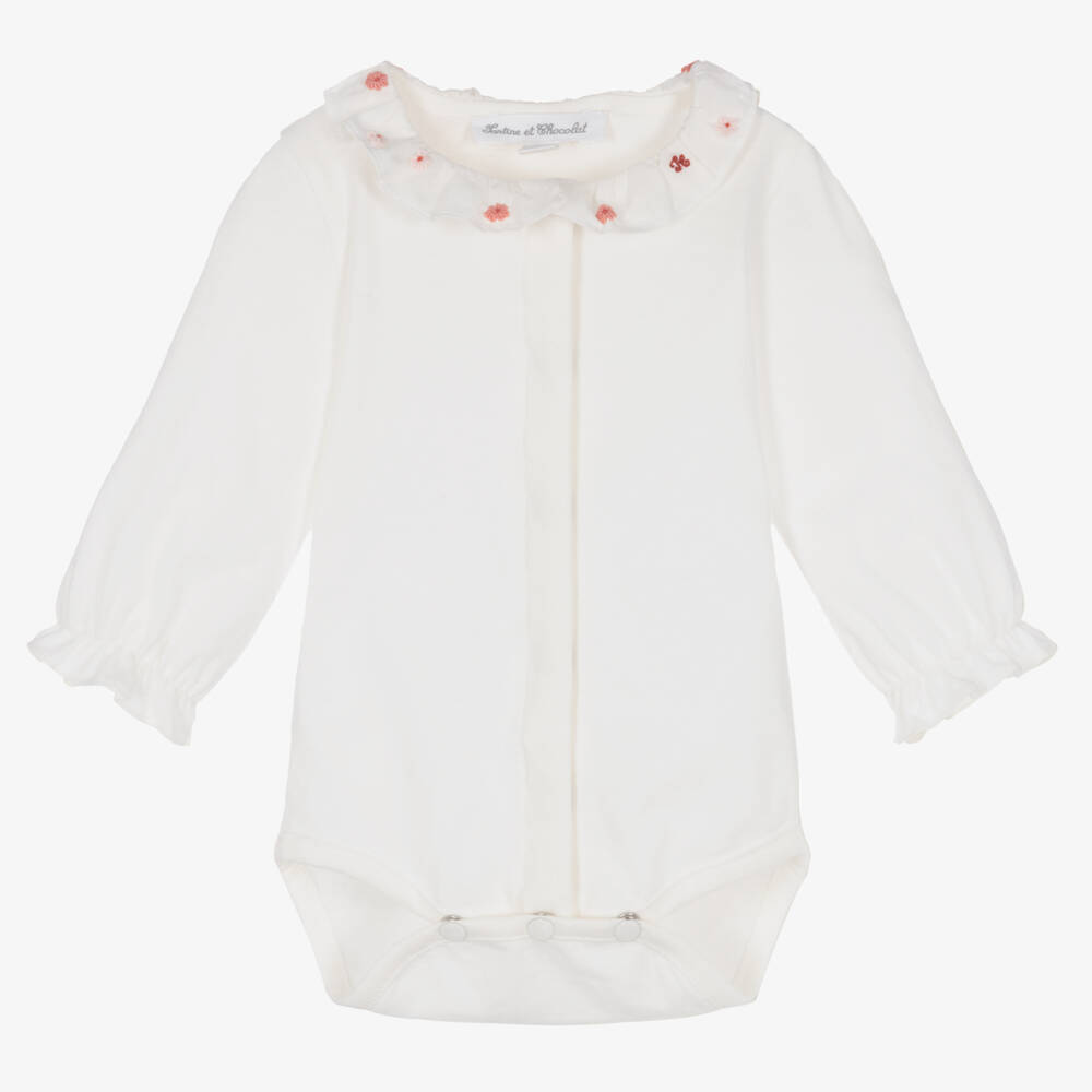 Lovely ivory cotton bodysuit for baby girls by traditional French brand Tartine et Chocolat. Made in soft, comfortable jersey, it has a lovely, ruffled poplin collar, embroidered with flowers and the brand's logo in shades of pink. It has gently elasticated, frilled cuffs and fastens with easy-to-use poppers on the front and between the legs, so it always looks neat and tidy and never becomes untucked.
