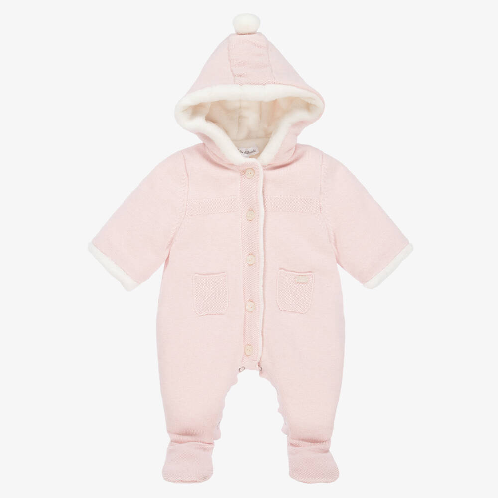 Cosy pale pink hooded pramsuit for baby girls by classic French brand Tartine et Chocolat. Knitted in a soft cotton, wool and cashmere blend, it has sweet moss stitch detailing and front patch pockets, one with a logo charm. The hood has a super soft, white faux fur pom-pom on top, coordinating with the warm, faux fur lining. The pramsuit fastens with logo buttons on the front and easy-to-use poppers between the legs for speedy changes.