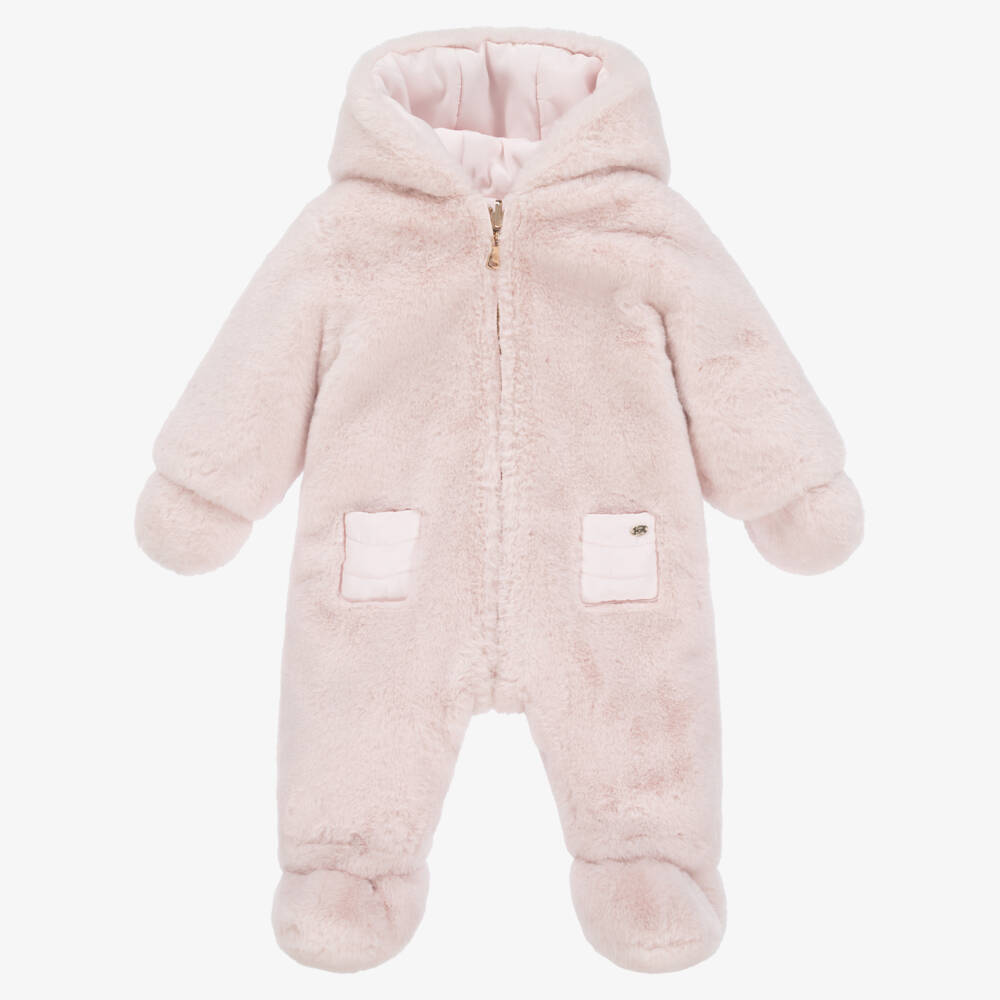 A reversible pale pink hooded snowsuit for baby girls by French brand Tartine et Chocolat. Cute and charming, this suit has a soft faux fur side with a silky smooth quilted reverse. It has front pockets and a gold zip fastening. The detachable mittens and booties fasten onto the snowsuit with poppers to keep your little one cosy.