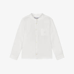 Blue linen shirt for boys by Tartine et Chocolat, styled with a classic collarless design. Suitable for warmer days, this long-sleeved shirt is made from lightweight linen fabric. The long sleeves are buttoned at the cuff for a polished look and the monogram embroidery on the chest adds a touch of luxury.