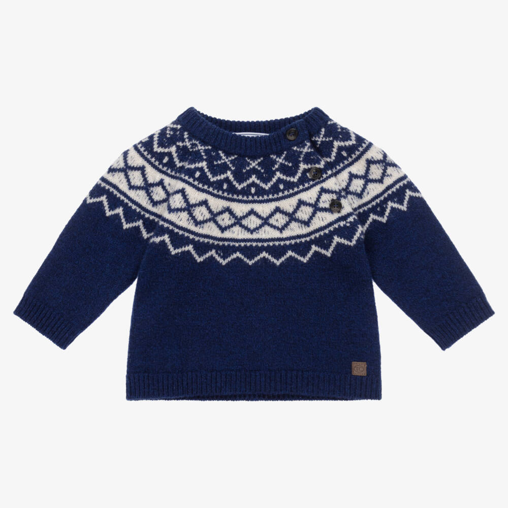 Dark blue sweater for little boys by Tartine et Chocolat, made in a beautiful wool knit. Fastening with branded shoulder buttons, this cosy layer has an ivory Fair Isle design on the chest and back and a branded logo tab sewn on the hem.
