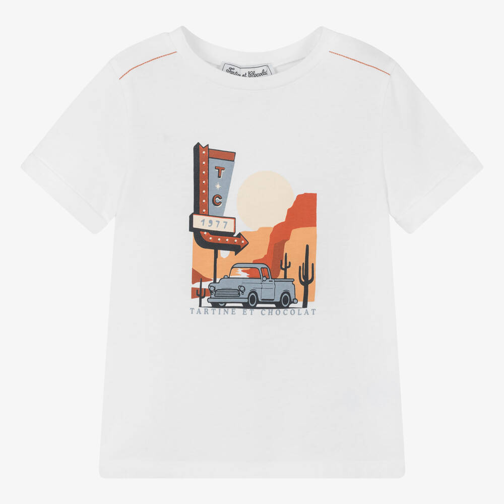 White cotton T-shirt for boys by classic French brand Tartine et Chocolat, with a truck and logo print on the front in pale grey and orange. Made in soft, comfortable jersey, it has orange overstitching on the shoulders and fixed, turned-up cuffs on the short sleeves.