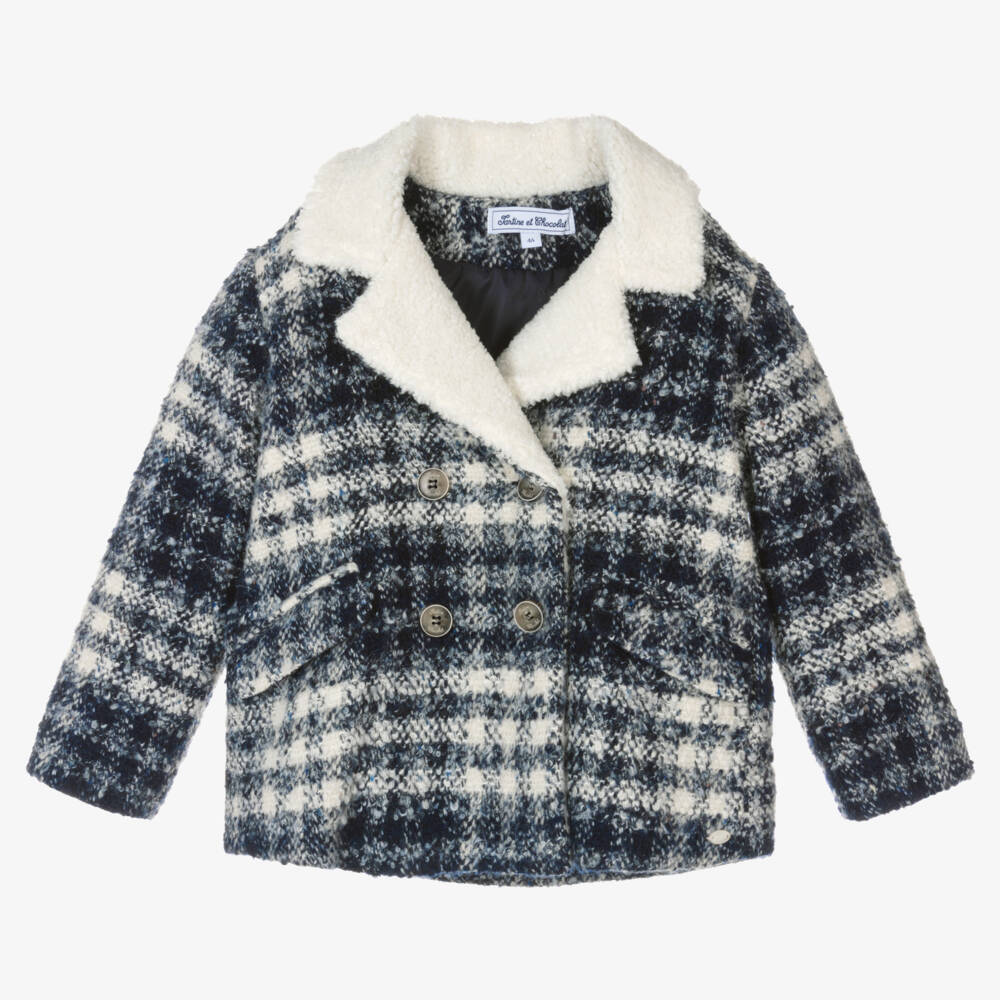 Stylish navy blue and ivory checked tweed jacket for girls by luxury French brand, Tartine et Chocolate. Made in a cosy wool blend with an ivory faux fur revere collar, this double-breasted jacket has front flap pockets and an inverted pleat on the back. It is lightly padded for added warmth and has a branded satin jacquard lining. For a discreet designer finish, there are logo-embossed button fastenings and a small branded tab on the front hem.
