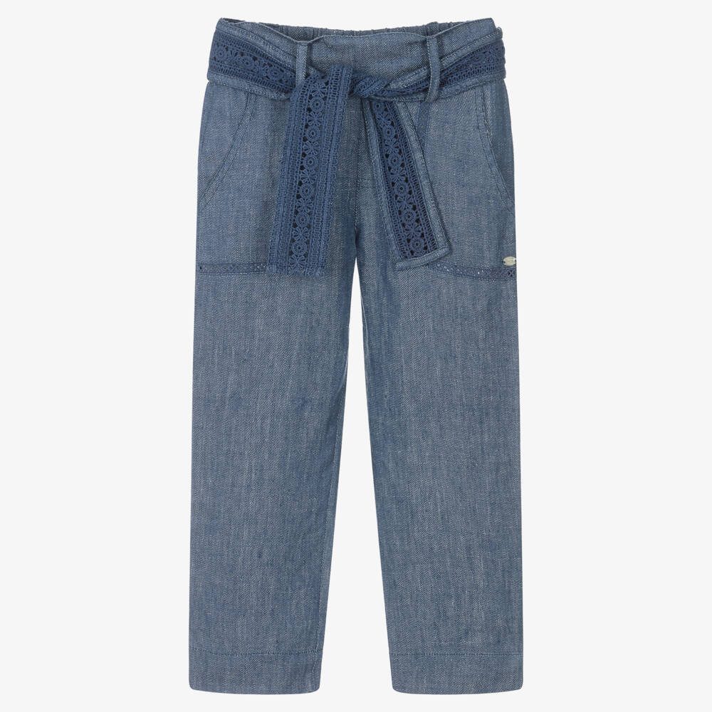 Casual blue trousers for girls from luxury brand Tartine et Chocolat, made in linen chambray. Beautifully styled with an elasticated waist for comfort, the front pockets are trimmed with cut-out detailing. A detachable sash belt with intricate crochet lace adds a touch of glamour.
