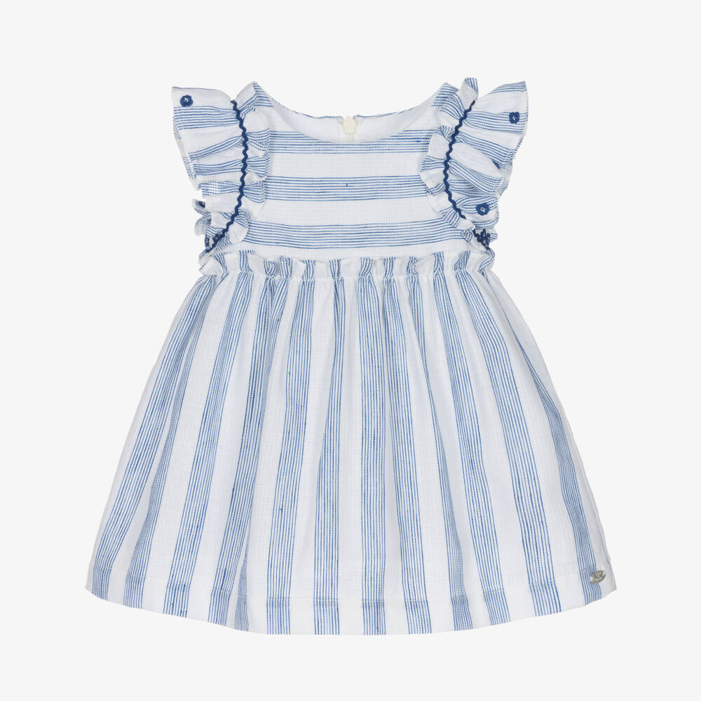 Cotton and linen blend dress for little girls by traditional French brand Tartine et Chocolat, with blue and white stripes. Cool and lightweight, it has ruffles over the shoulders embroidered with blue flowers and trimmed in coordinating ric rac. The full, gathered skirt has a frilled waist and a mother-of-pearl logo charm sewn by the hemline. The dress is lined in voile for comfort and fastens with a neat, concealed zip around the back.
