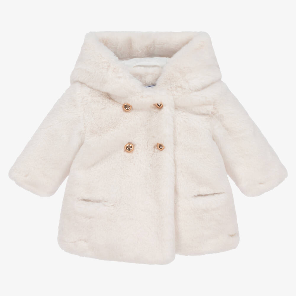 A gorgeous ivory faux fur coat for little girls by French brand Tartine et Chocolat. Soft and snuggly, this coat has gold button fastenings, a hood and concealed front pockets. The lining is silky smooth, and a pearlescent logo charm is featured on the hem.