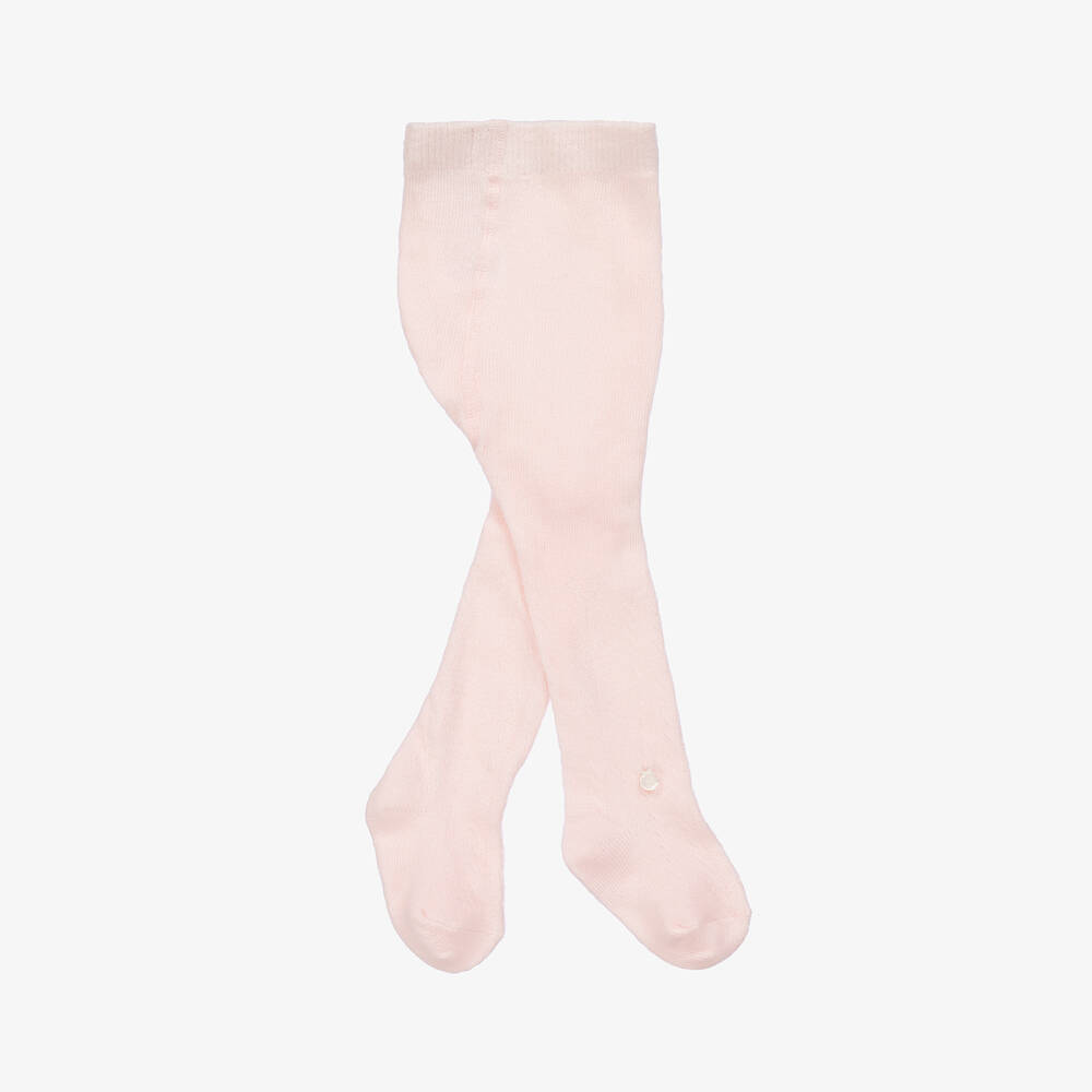 Pretty pale pink tights for girls by French brand Tartine et Chocolat. Knitted in a soft and stretchy cotton blend, they have a delicate pointelle pattern and a pearly logo disc on one ankle.