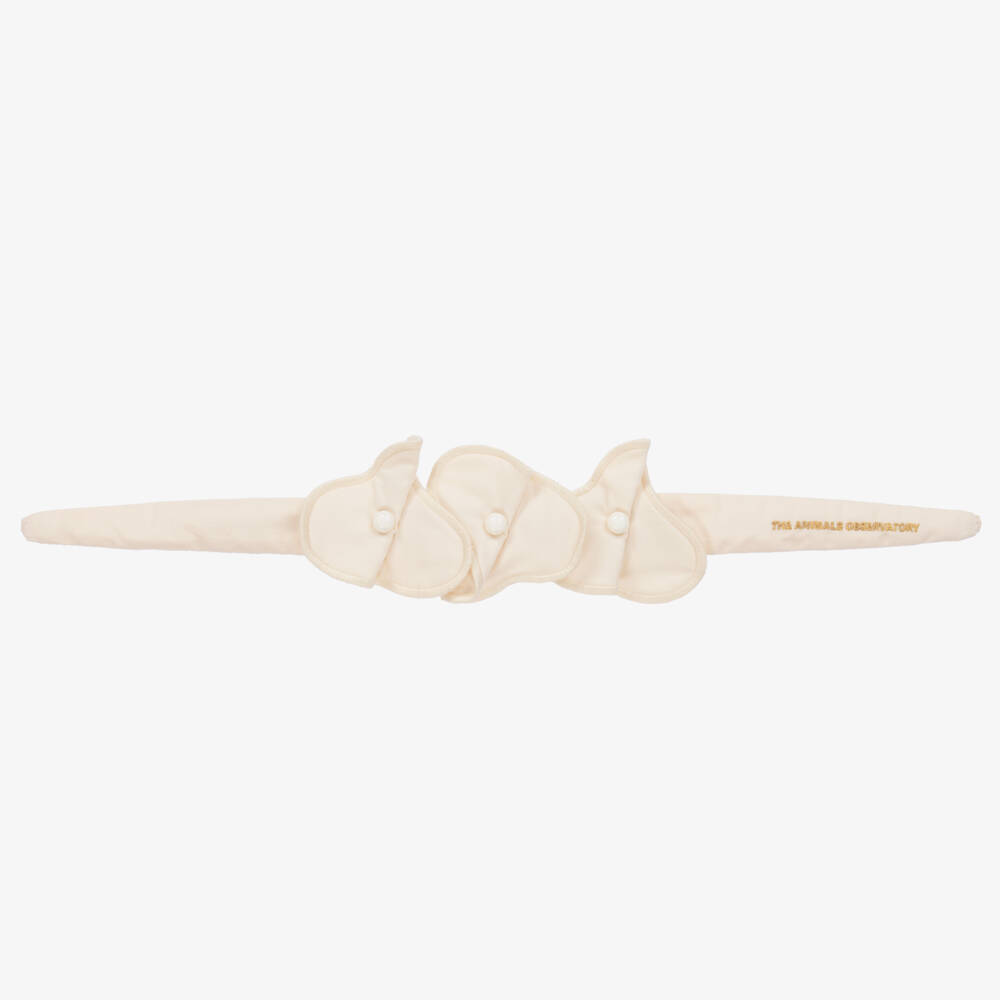 Ivory cotton belt for girls from The Animals Observatory, made in soft twill. It has three appliqué flowers with button centres and a gold embroidered logo on one side. With a simple tie-fastening design, the belt is ideal for adding feminine shaping to her outfit.