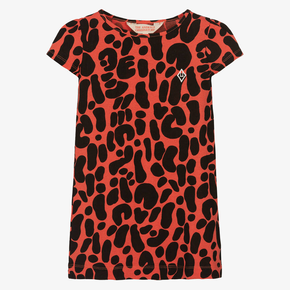 Red cotton T-shirt dress for girls from The Animals Observatory. This cool design is made in comfortable and lightweight jersey, with a black abstract animal print pattern, capped sleeves and a white embroidered logo on the front for added designer appeal. Its slip-on style makes dressing quick and simple.