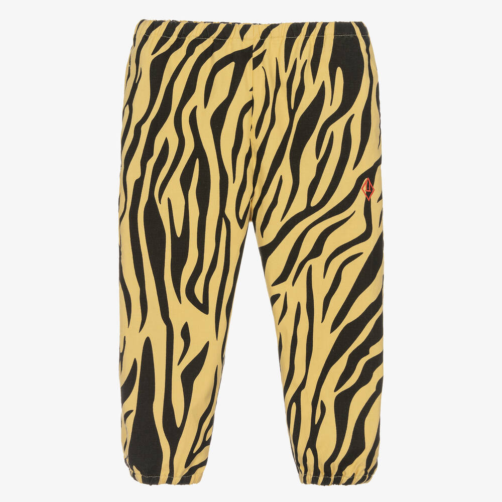 Loose-fitting trousers for boys and girls by The Animals Observatory, with a yellow and black zebra print. Wonderfully comfortable, they are made in cotton, with a stretchy, elasticated waistband and cuffs. They have useful, concealed side pockets and a red, embroidered logo on one leg.