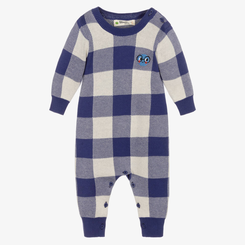 A blue and ivory romper for baby boys by British brand The Bonnie Mob, knitted in super soft organic cotton. This playful babygrow is patterned in a gingham check, with an adorable smiling face embroidered on the chest. There are button fastenings on the shoulder and between the legs to make changing easier.