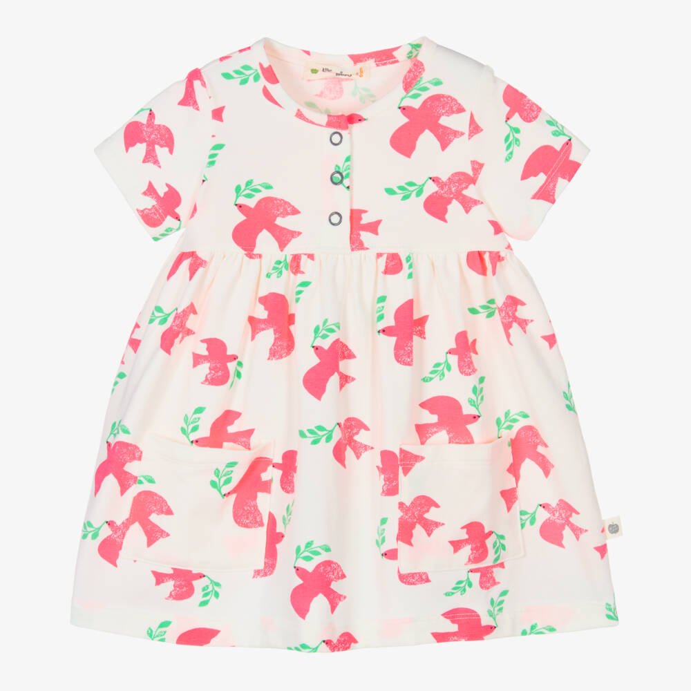 Baby girls ivory dress by The Bonnie Mob, made in organic cotton jersey. Patterned in an all-over neon pink and green dove print, this fun, short-sleeved dress has a comfortable round neck, a sweet gathered waist, and two patch pockets on the front. Led by softness and comfort, it has popper fastenings on the chest, making it easy to slip over your little one's head.