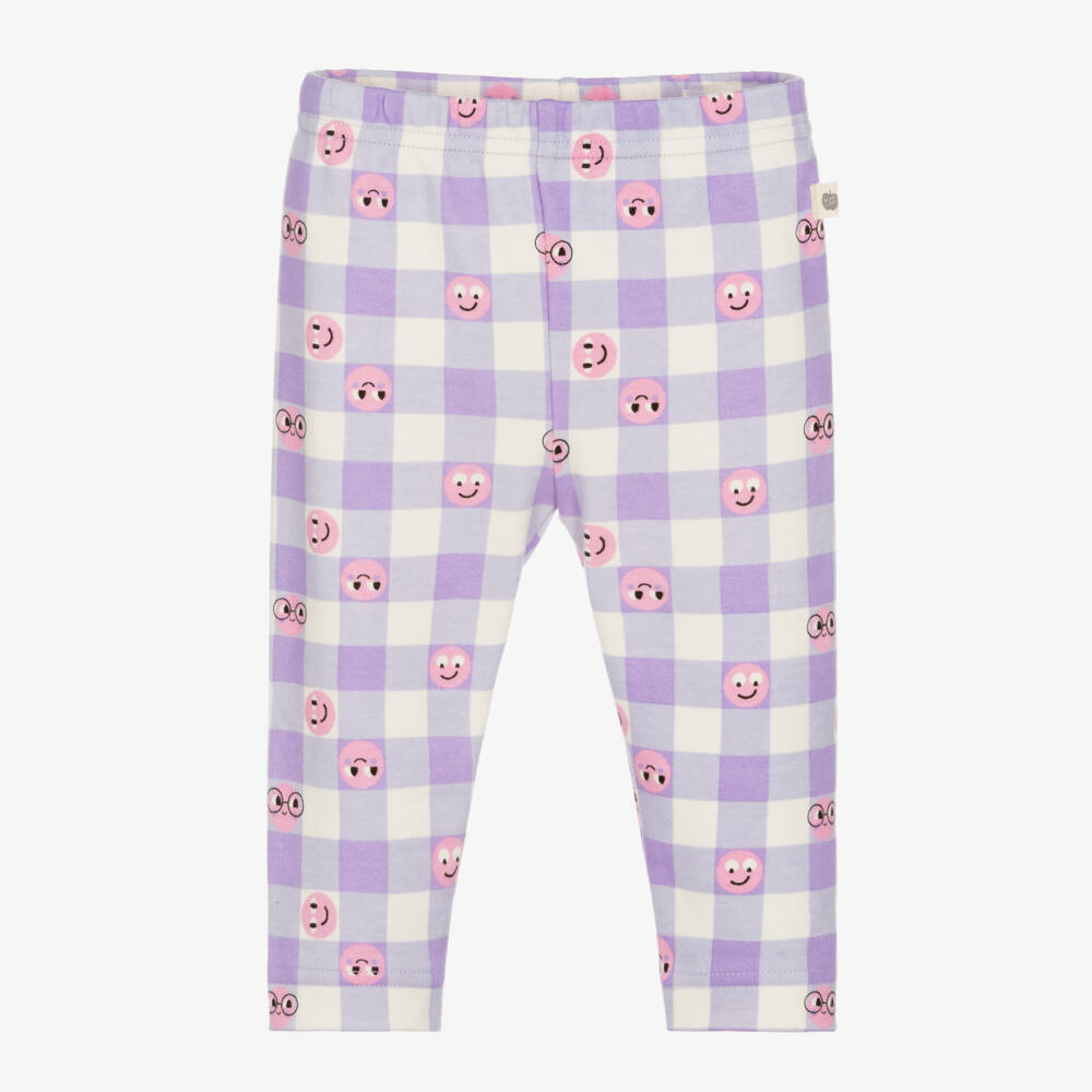 Purple and ivory organic cotton leggings for baby girls by British brand The Bonnie Mob. These jersey leggings are patterned in a delightful gingham check, with playful pink smiling faces throughout. Easy-to-wear and comfortable on little tummies, there is a stretchy elasticated waistband.