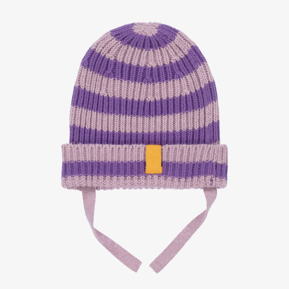 A lovely purple striped hat for baby girls by British brand The Bonnie Mob. Knitted in a soft blend of organic cotton and cashmere, it is sure to keep little heads warm and cosy. It secures with knitted ties under the chin.