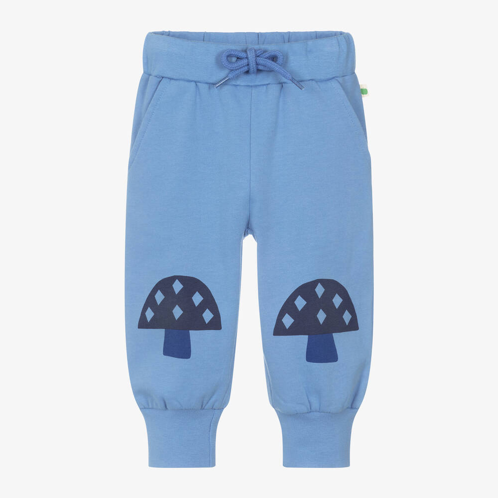 Casual blue joggers for baby boys and girls by British brand the bonniemob, with navy blue mushroom prints on the knees. Soft and comfortable to wear, they are made in organic cotton jersey with a cosy fleece feel inside. The stretchy waistband can be adjusted with a drawstring and there a slanted front pockets.