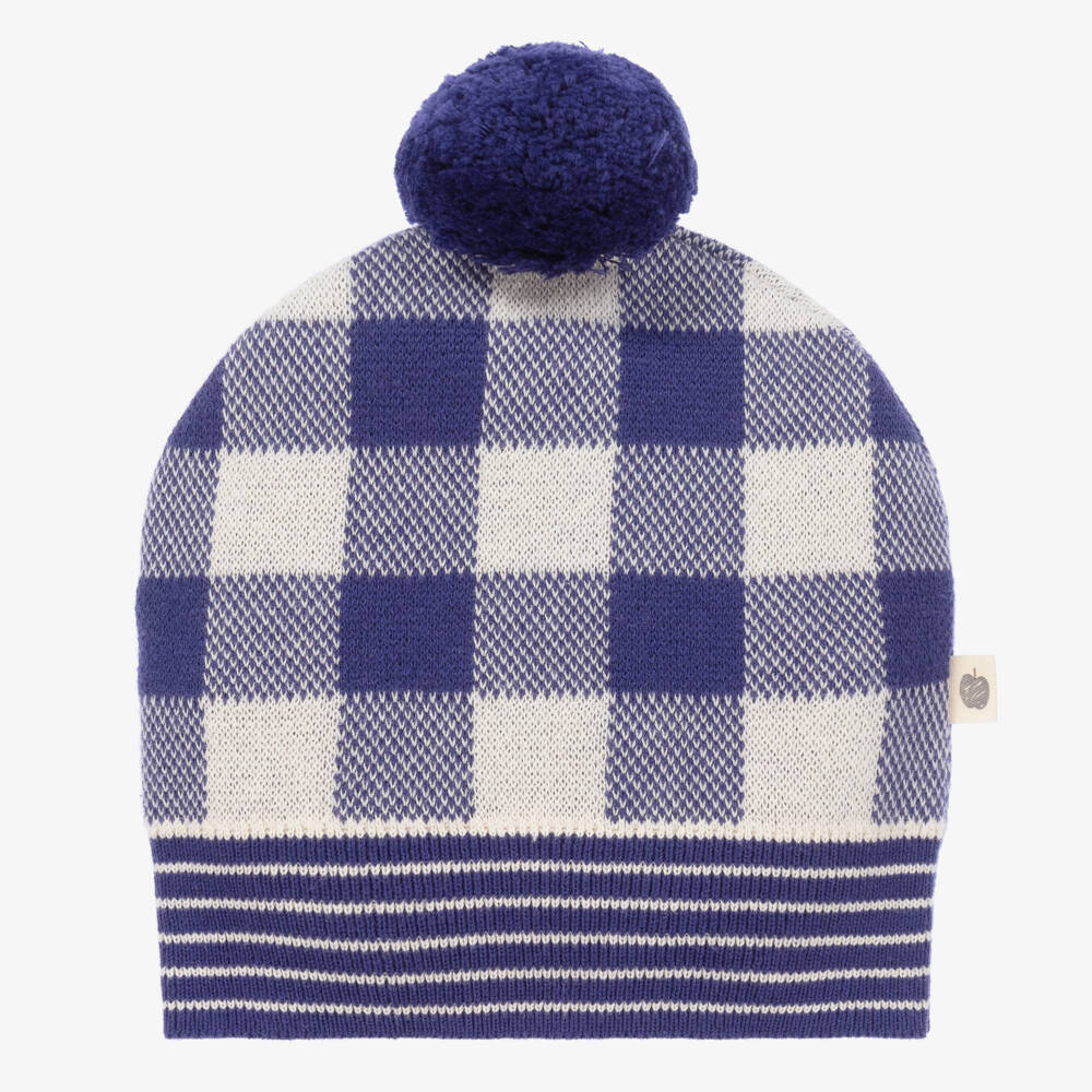 A sweet blue and ivory checked hat for baby boys by British brand The Bonnie Mob. Finely knitted in soft organic cotton, it is sure to keep little heads warm and cosy. It has a striped brim and a cute fluffy pom-pom on top.