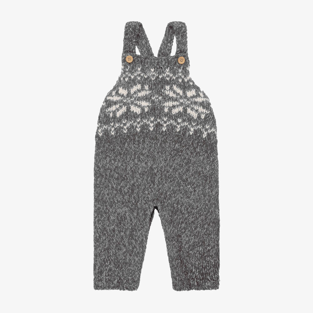 Dark grey dungarees for baby boys and girls by The Little Tailor, knitted in a beautifully soft cotton blend. Worn alone or layered over a T-shirt, these cosy dungarees have an ivory Fair Isle pattern on the front. The shoulder straps fasten with wooden buttons on the front and cross over on the back. Popper fastenings between the legs make dressing and changing easier.