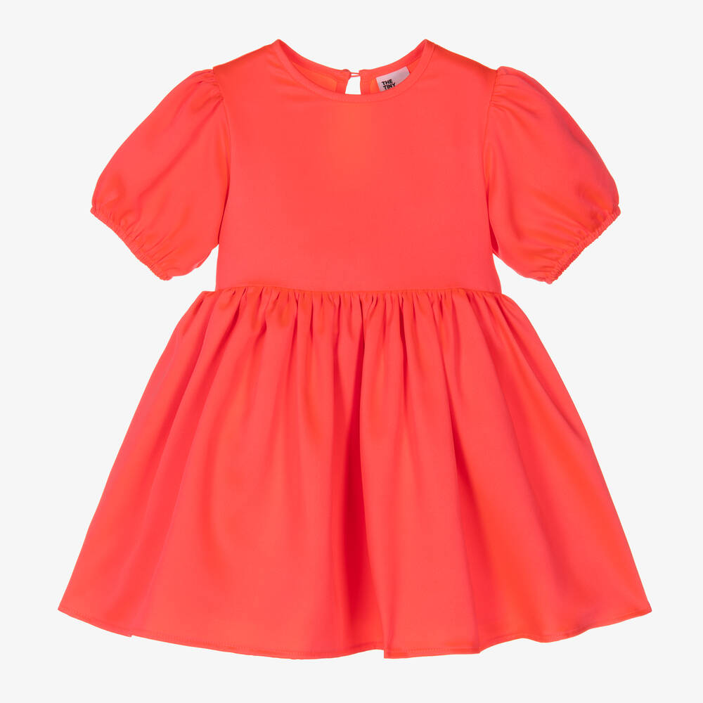 Beautiful neon pink dress for girls by Swedish brand The Tiny Universe, made in sumptuous satin. It has pretty puffed sleeves with gently elasticated cuffs, and a full gathered skirt with a tulle underlay for extra volume. There is a keyhole button fastening on the back and a long sash that ties in a bow.