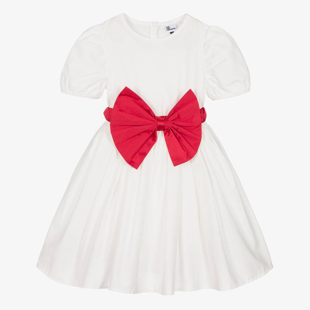 A lovely white cotton poplin dress for girls by The Tiny Universe. It has elegant puffed sleeves and a stand-out red satin bow belt. The belt is detachable and fixes onto the front with poppers, and secures at the back with velcro. The pleated skirt has a shorter length cotton lining, with a layer of stiff tulle for extra volume. The dress is trimmed with a tonal logo badge at the back, and has a concealed zip fastening.