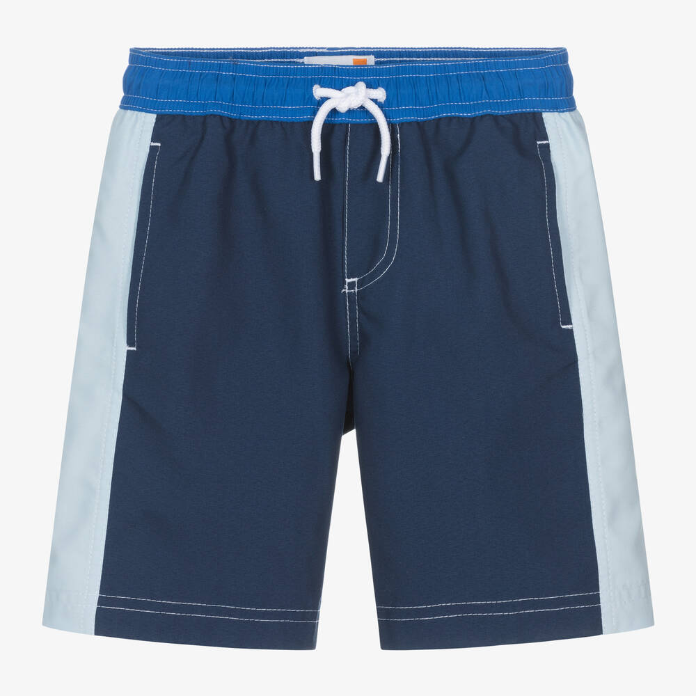 Cool blue colourblock swim shorts for boys by Timberland, with contrasting white stitching. Lightweight and velvety soft with a mesh insert providing extra comfort, they simply pull on and have a functional drawstring for a good fit. There are discreet front pockets and a rubberised logo patch on the back pocket.