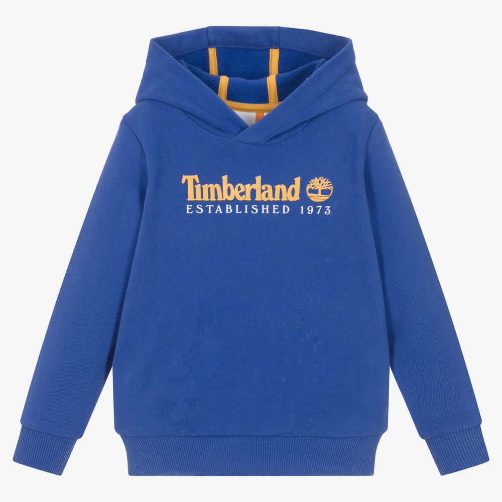 Blue hoodie for boys by American brand Timberland, made in a soft mid-weight cotton-blend jersey. Casual and comfortable, it has stretchy ribbed trims and useful concealed side seam pockets. For designer appeal, there is an orange and white logo print across the front, with a coordinating orange trim in the pockets and inside the hood.