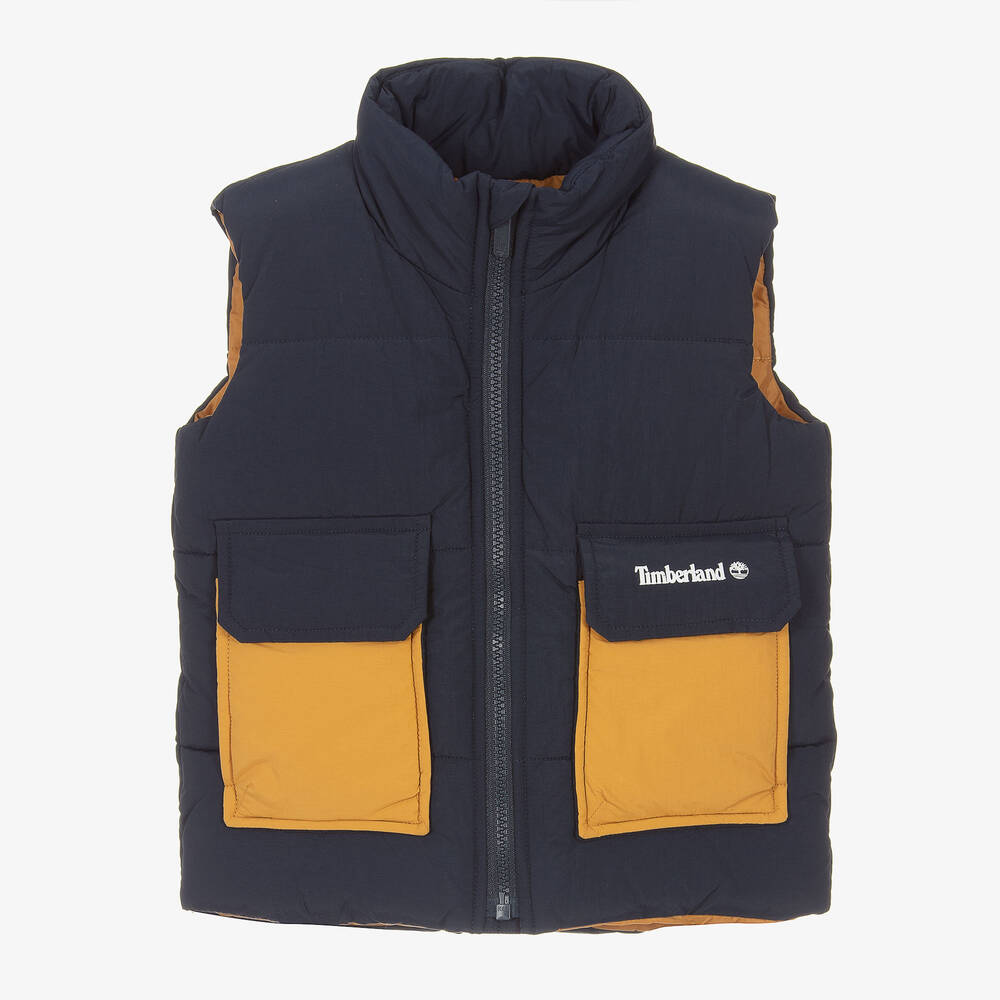 Синий пуховый жилет для мальчиков от Timberland с горчичными передними карманами и подкладкой. Водоотталкивающая и слегка утепленная, эта практичная модель имеет застежку-молнию спереди до подбородка. Для узнавания бренда на одном из карманов с липучкой виден белый логотип. Эта модель содержит не менее 70% переработанных материалов.