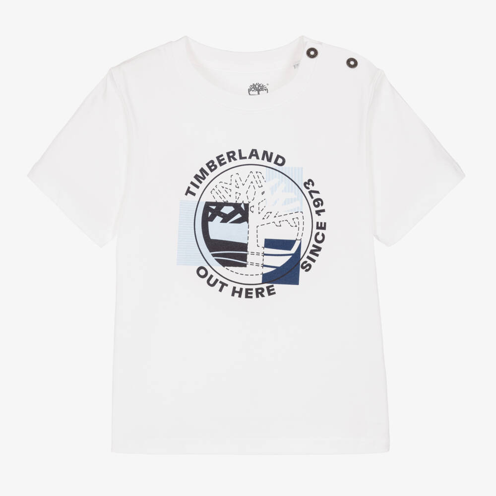 White T-shirt for boys by Timberland, made in soft and comfy organic cotton jersey. It has the brand's iconic tree logo on the front, in black and blue. There are branded metal popper fastenings on one shoulder for an extra designer touch.