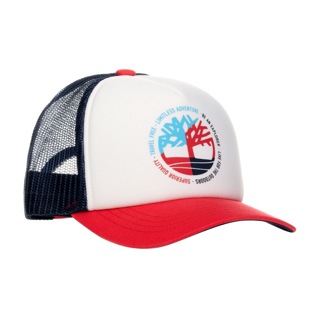 Navy blue, red and ivory cap for boys by Timberland. The back is made in soft mesh, whilst the ivory front is soft neoprene with the brand's signature logo in red, navy blue and pale blue. There is a contrasting red peak and adjustable strap at the back.