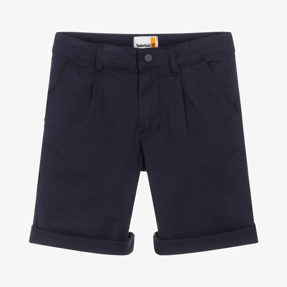 Teen boys navy blue chino shorts by Timberland, great for achieving a smart-casual look. This timeless style features the iconic tree logo badge on the back pocket for a branded touch. Woven in lightweight cotton twill, they have stylish turned-up cuffs and a smooth zip and popper fastening.