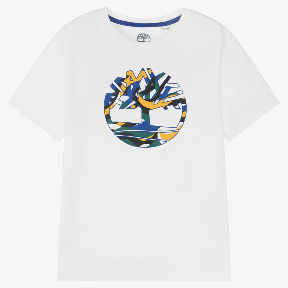 Casual white organic cotton T-shirt for teen boys by American brand Timberland, as seen in the adult collection. Ideal for relaxed days, it is made in soft, comfortable jersey. On the front is the brand's iconic tree logo printed in blue, green and yellow.