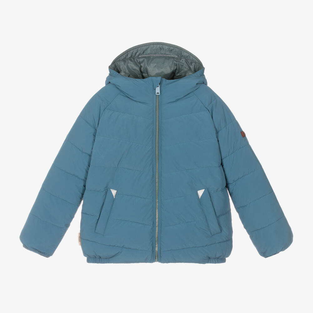 A reversible, hooded puffer jacket for boys and girls by British brand Töastie, matt light blue on one side and silky fern green on the other. This water-repellent outerwear piece is lightweight yet provides superior warmth with mid-weight insulation. The hood has a short peak and is gently elasticated on the sides for added protection from the weather. Both sides feature fleece-lined pockets with popper fastenings, reflective detailing for improved visibility, logo tabs on one sleeve and branded elasticated cuffs.