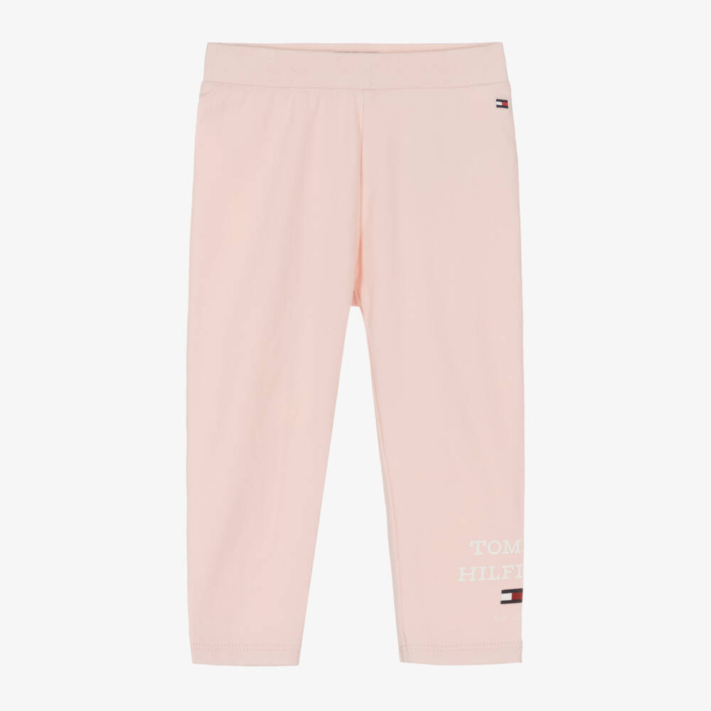 Pink cotton leggings for baby girls by Tommy Hilfiger. Made in comfortable, stretchy jersey that is beautifully soft to the touch, these full-length leggings have the American brand's classic logo print on one ankle and the signature flag logo embroidered on the hip.