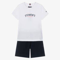 White and bright blue cotton shorts set for boys by Tommy Hilfiger. This casual staple is made in super soft and comfortable jersey with embroidered iconic flags, logo print and signature stripes. The T-shirt is lightweight while the shorts are mid-weight with a drawstring waistband and three pockets.